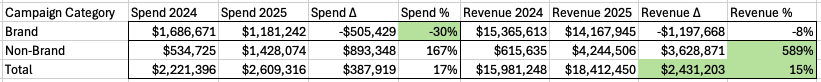 Non-brand campaigns scaled dramatically while overall spend increased only modestly.